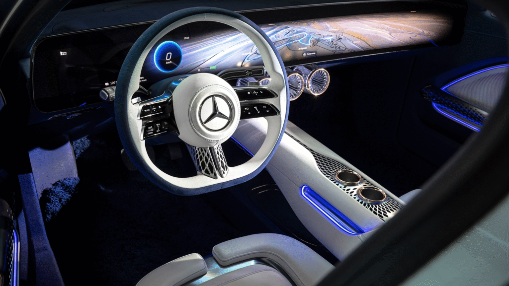 The Vision EQXX is a bold look at future luxury from Mercedes. Its interior uses eco-materials (bamboo, mycelium seats), and a massive high-res display across the dash. Wikipedia Mercedes positions this vehicle as “how we imagine the future of electric cars”.