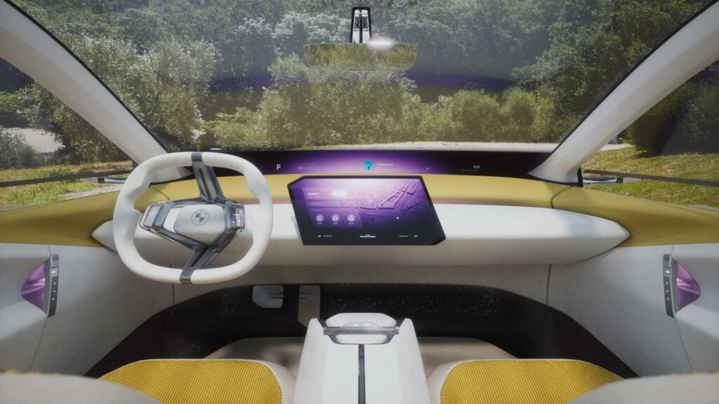 The Vision Neue Klasse concept previews BMW’s next generation of EVs and interiors. It features minimalist design, fewer materials, “Panoramic Vision” wind-screen display and avoidance of traditional chrome or leather. Wikipedia